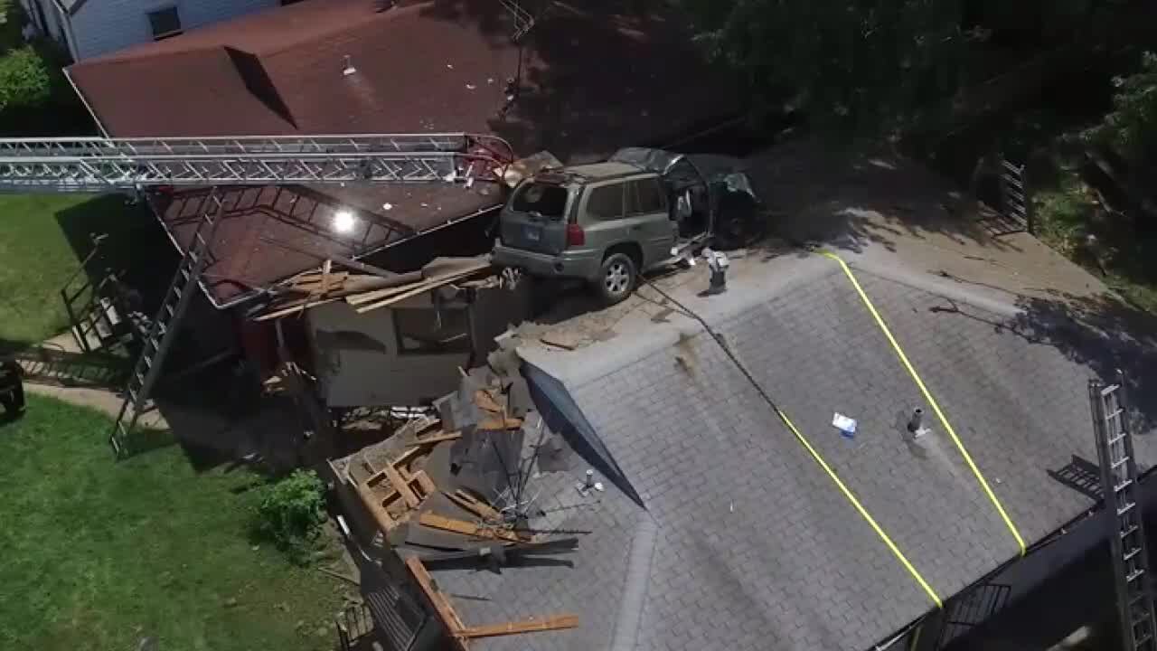 Police say the car was speeding down the road and lost control of the vehicle, launching off a hill and right onto the roof of the home.