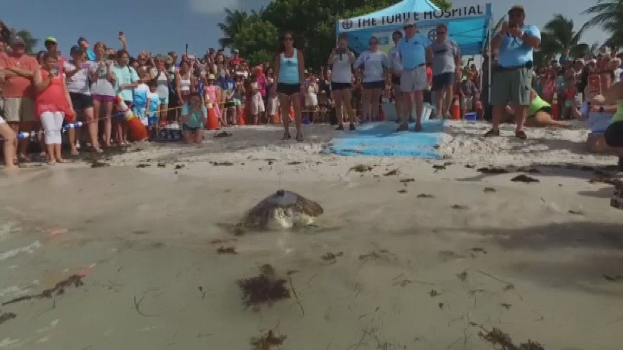 A green sea turtle was released into the wild Friday after being entangled in fishing gear and then rehabilitated at the Florida Keys-based Turtle Hospital.