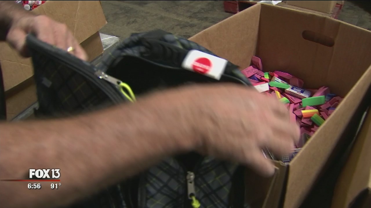 A team of volunteers is moving at a fast pace, filling backpacks for kids in need at Metropolitan Ministries inside a Tampa warehouse.