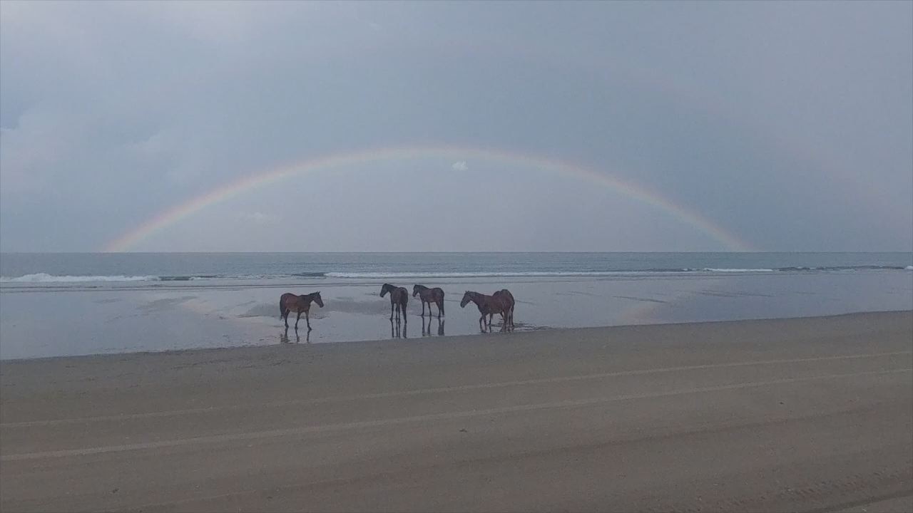 These native horses were spotted enjoy a North Carolina beach after a storm under a rainbow. Credit: Corolla Beach Music via Storyful