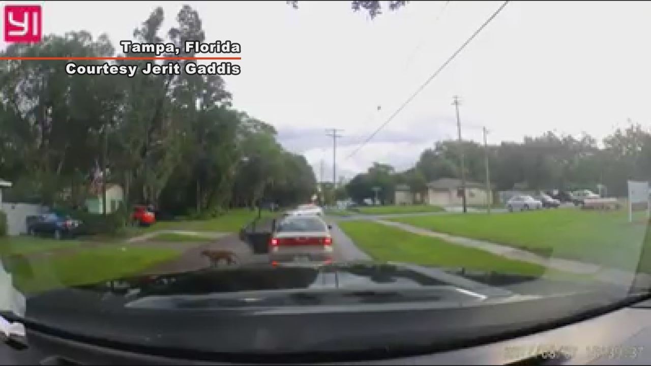 Video shared by Jerit Gaddis shows a car dropping off a dog in a Tampa neighborhood, then driving away.