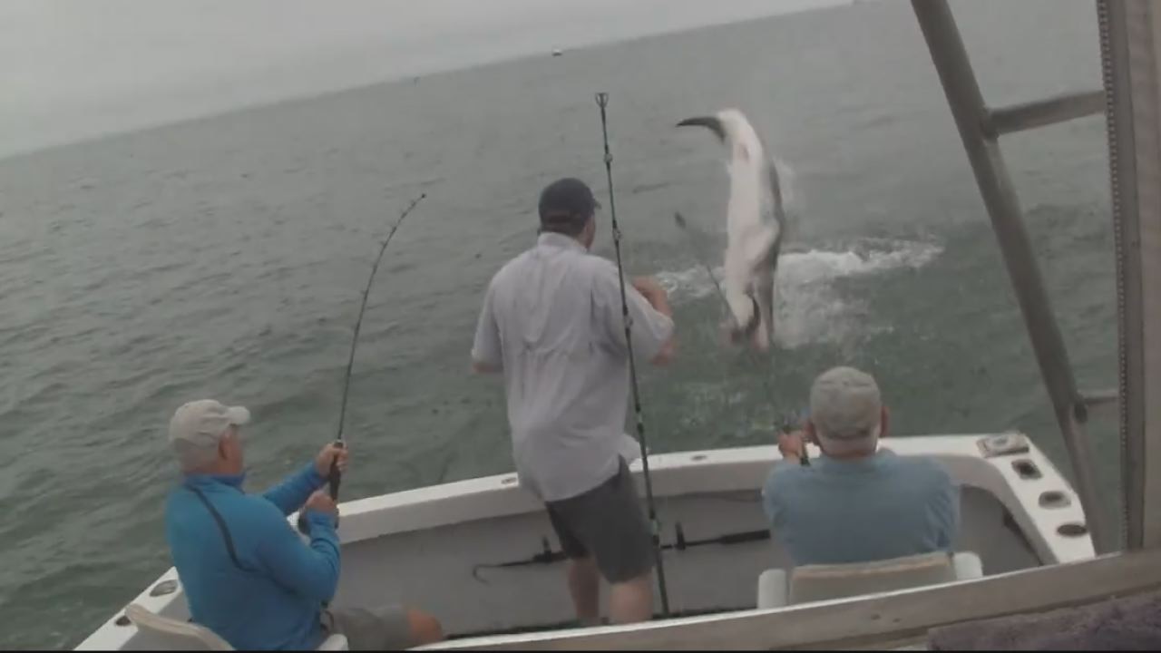 Video captured a great white shark leap from the water and steals a fisherman's catch.