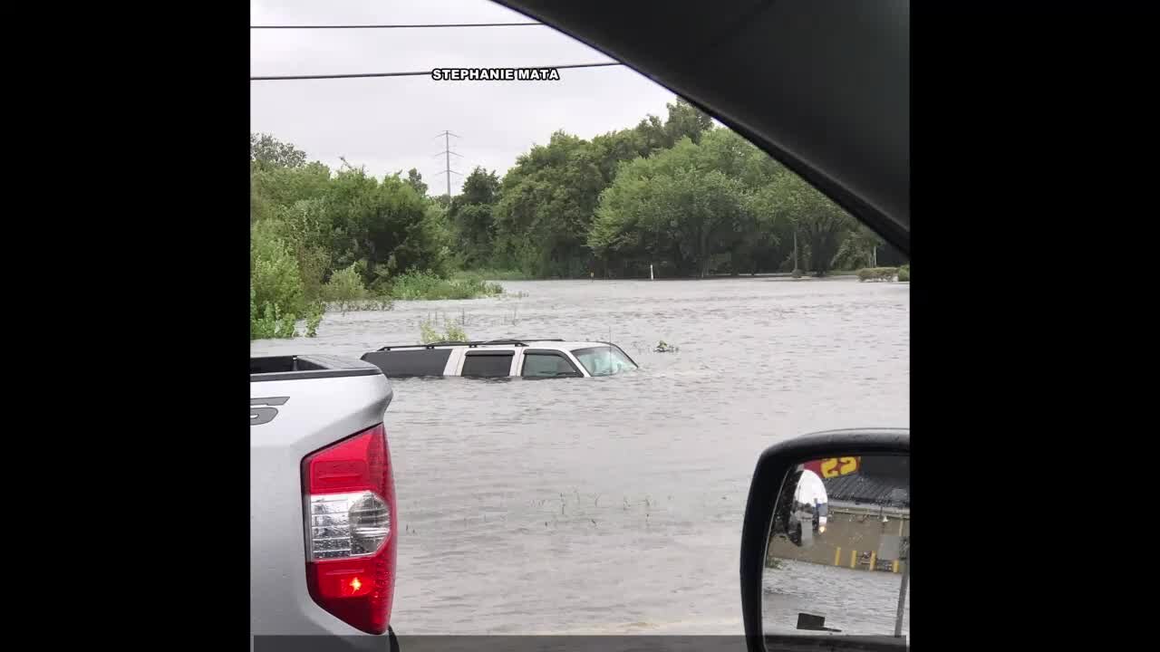 An elderly man who was stuck in his SUV in the flooding in Houston was rescued by more than a dozen bystanders who joined hands to form a human chain. VIDEO: STEPHANIE MATA