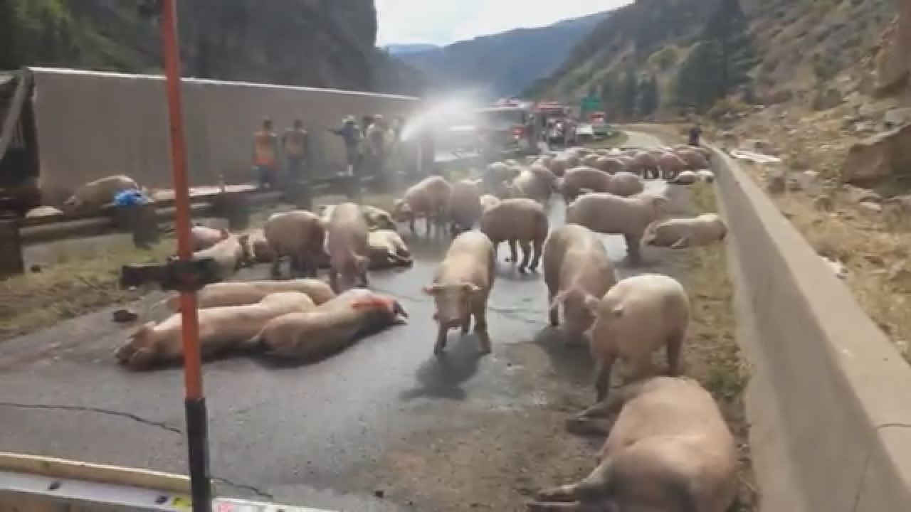A livestock truck crashed along an interstate about a mile outside of Glenwood Springs, Colorado, tipping over and spilling dozens of pigs into the road.