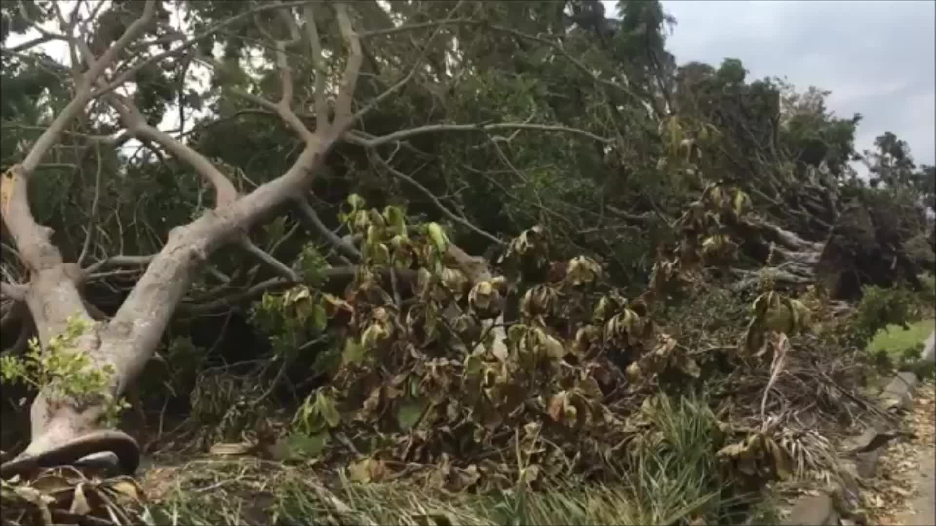 Video shared by City of Miami Commissioner for District 2 Ken Russell shows a line of downed trees in a residential neighborhood in Miami. (STORYFUL)
