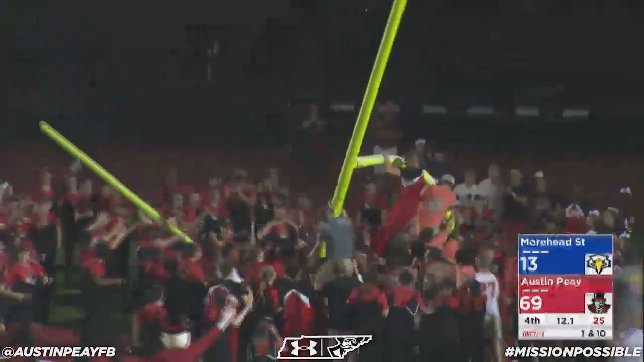Austin Peay Governors football fans celebrated the team's first competitive win in 29 games by invading the field at Fortera Stadium, and bringing down the goal post. Courtesy: Twitter/AustinPeayFB via Storyful