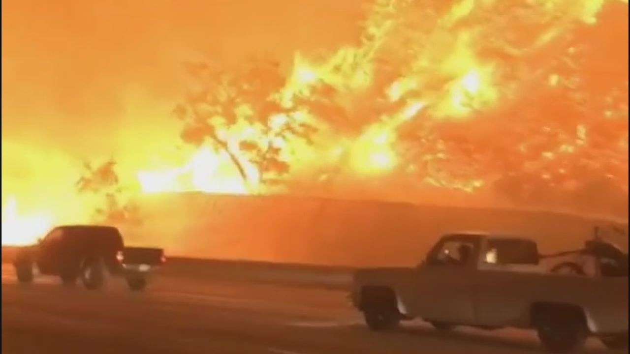 Fire burns close to California freeway