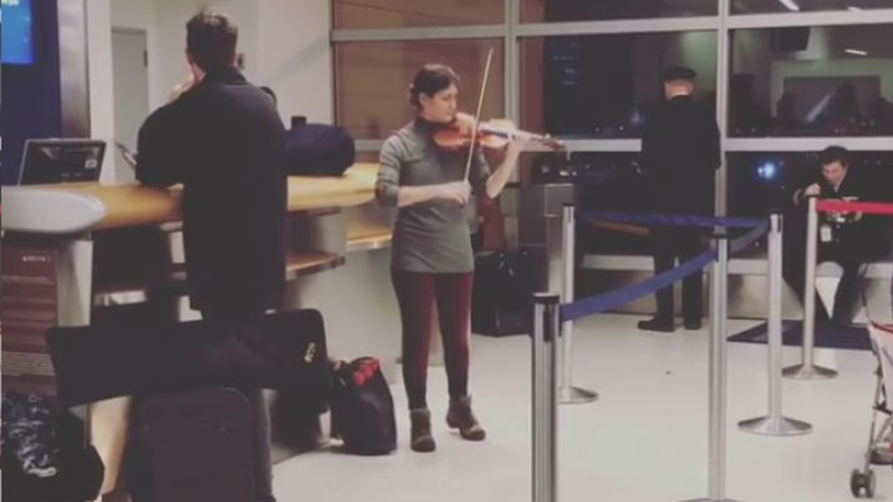 Violinist serenades passengers at JFK