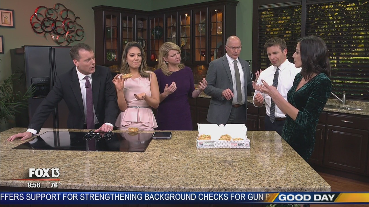 Since we have a Krispy Kreme right next door, we figured we'd try their new 'gold' doughnut. Since it contains peanuts, though, Laura Moody had to skip the treat.