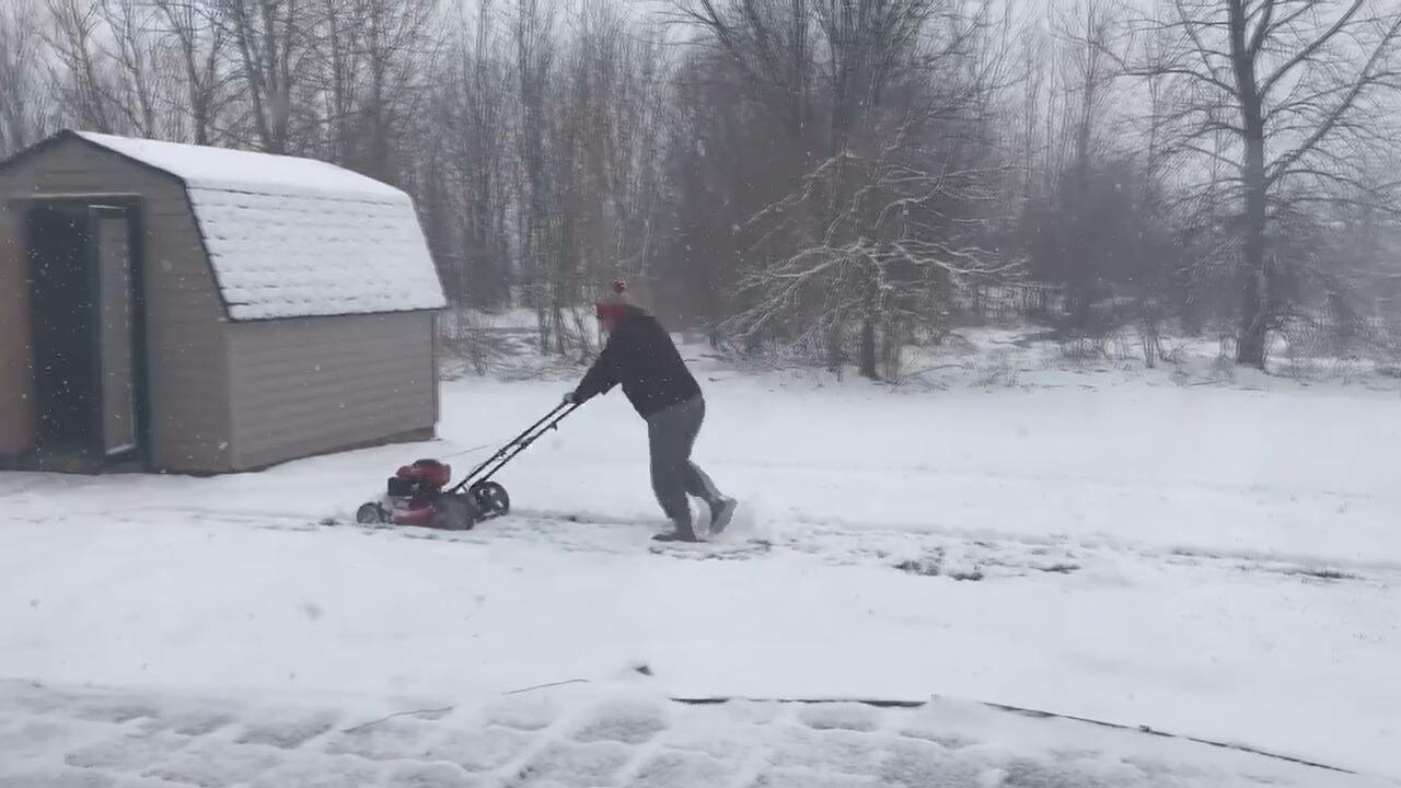Tommy McDowell shared video of mowing the lawn in the snow and joked on Facebook: ?The grass is growing so I must be mowing, even if it?s snowing.? Credit: Tommy McDowell via Storyful