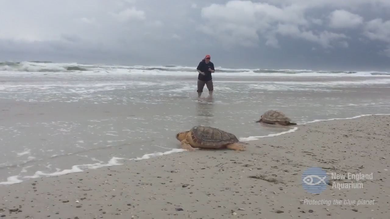 Biologists from the New England Aquarium released 14 endangered and threatened sea turtles into the Atlantic Ocean off the coast of Florida on Monday. The animals spent the winter near Boston recovering from various illnesses. Courtesy: New England Aquarium via Storyful