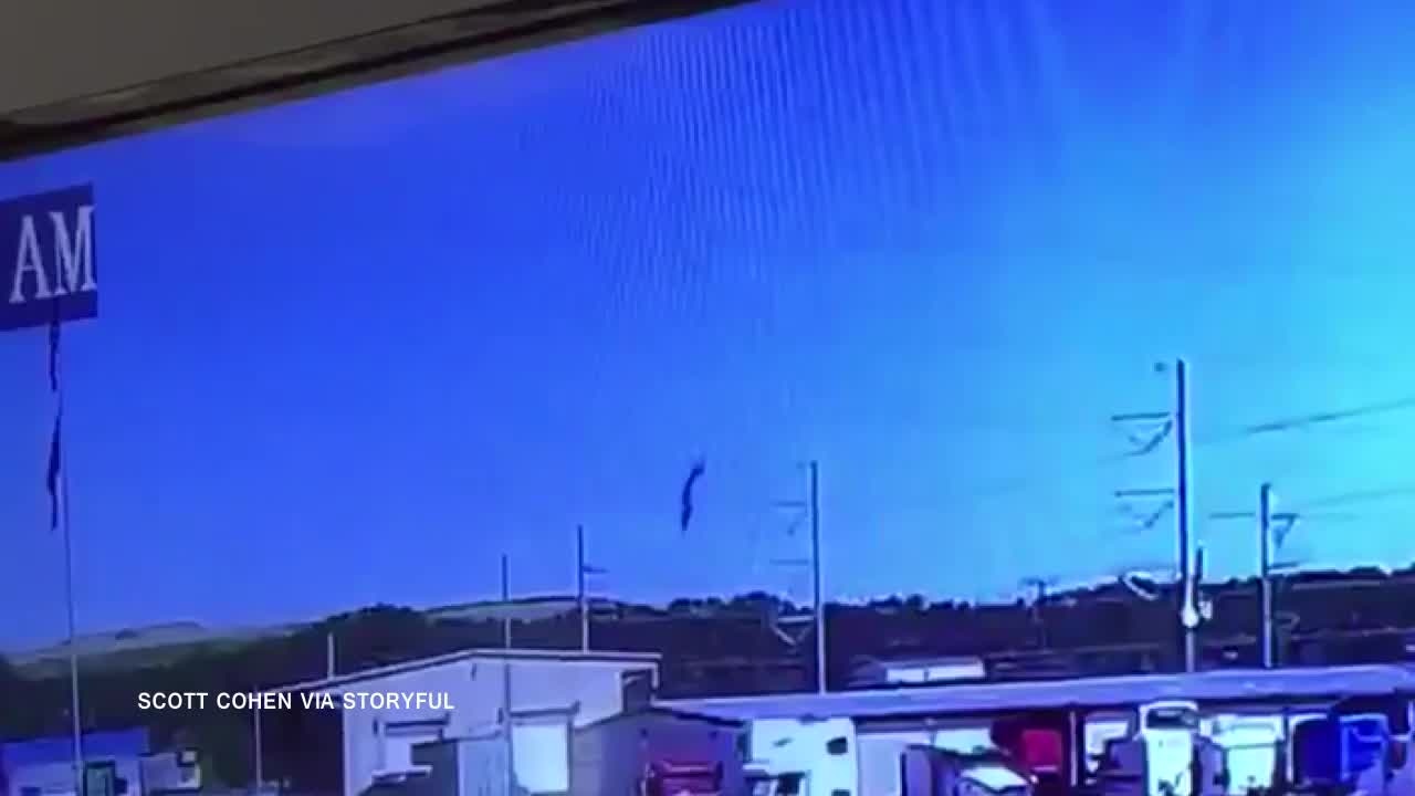 Surveillance video captured by?a business located near the airport shows an airplane descending?nose first into the ground, and then a large plume of smoke rising?above the horizon
