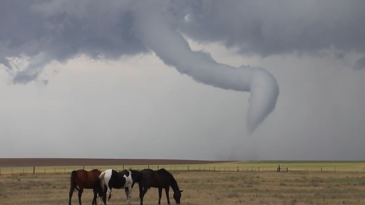 A funnel cloud was spotted near Denver, Colorado, while portions of the state were under severe thunderstorm and tornado warnings. Video shows horses grazing in a field in Adams County while a funnel cloud developed in the distance.