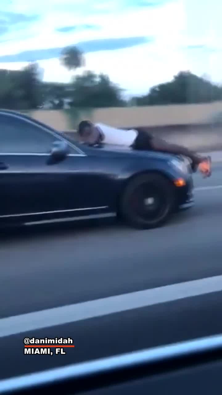A man was captured on video riding down I-95 in South Florida on top of the car, clinging to the hood. VIDEO: @danimidah/Twitter