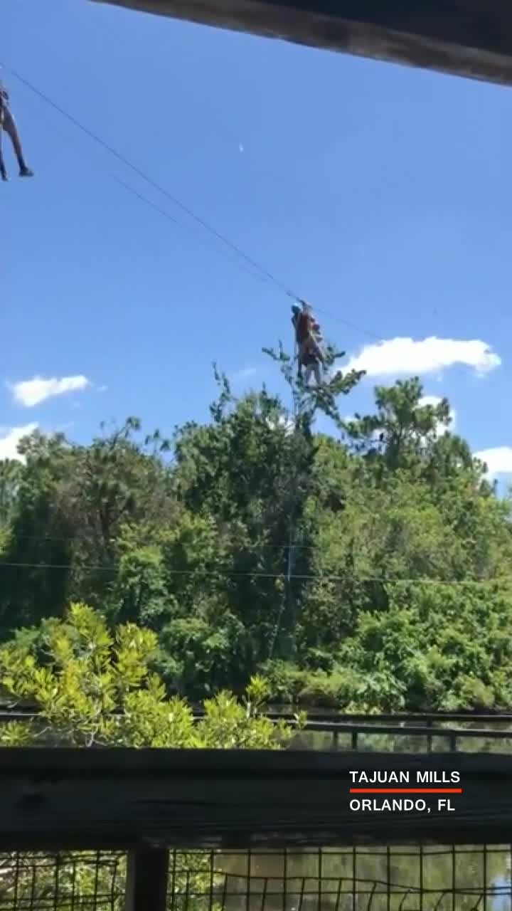 A man and a child were rescued after being suspended high above alligators while stuck on a zipline in Orlando.