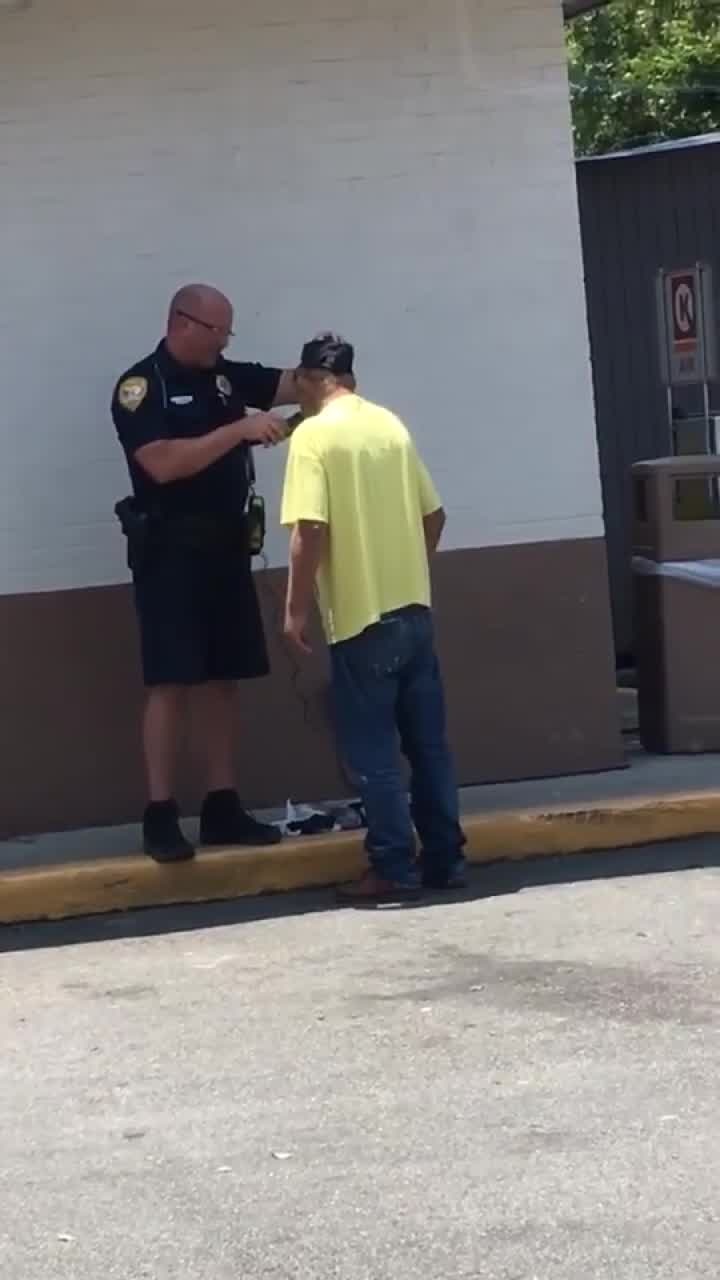 An officer helps a homeless man shave to get ready for his job interview. Video and photos of the officer's kindness were posted by bystanders to social media.