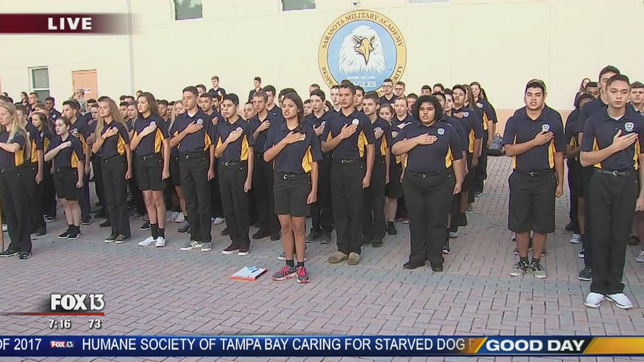 The cadets at Sarasota Military Academy start the day with the Pledge of Allegiance.