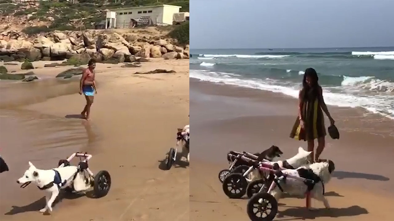 An adorable group of ?wheelie dogs? from a Moroccan animal shelter have a blast on the beach in this footage shared to Facebook on September 15. Credit: SFT - Animal Sanctuary via Storyful