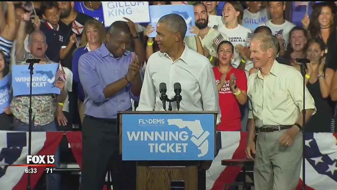 Former President Barack Obama told attendees at a Friday campaign event for Florida's Democratic candidates that democracy can't work when words stop having meaning.