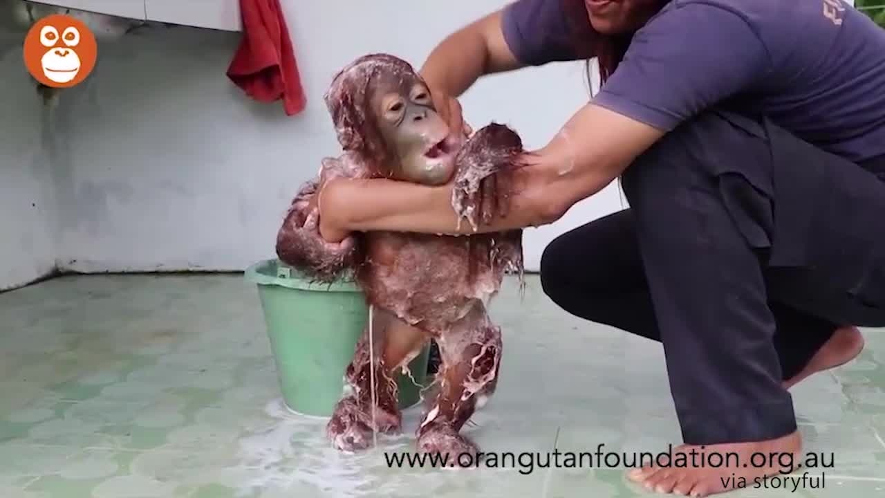 An adorable baby orangutan enjoyed a sudsy sponge bath after a long day in jungle school.