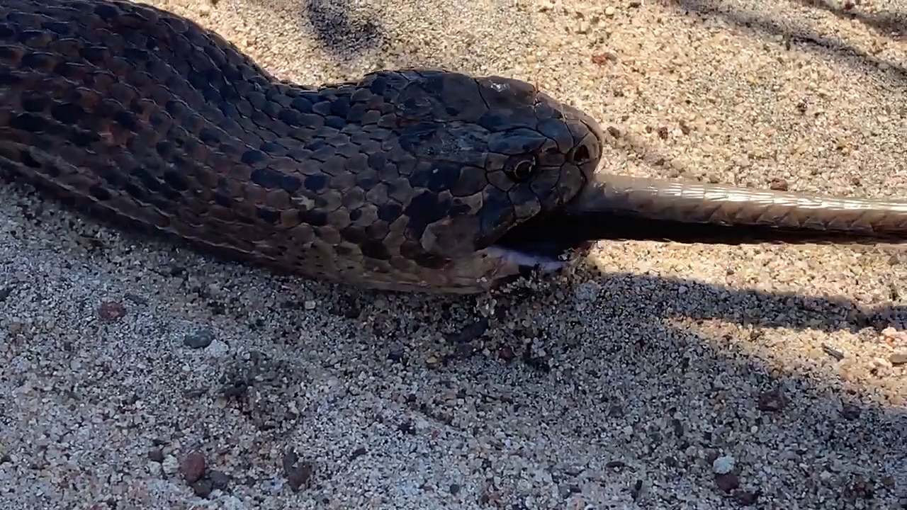 Brett Butler was taking a Sunday stroll in the Perth suburb of Ocean Creek on December 9 when he came across the impressive sight of a large snake in the middle of its meal.