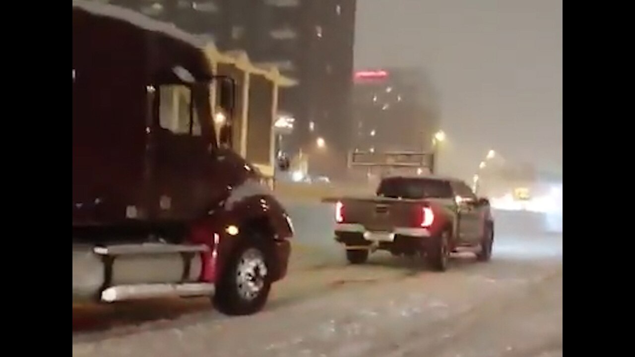 A Missouri man praised the actions of a Chevy pickup truck driver who helped several trucks stuck on an icy highway in St. Louis on January 11. Credit: Adam Bosler via Storyful