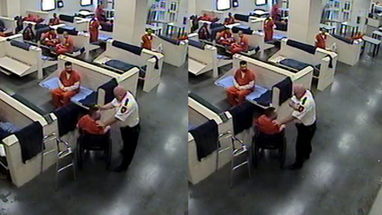 A Pinellas County detention deputy was fired after he was caught repeatedly hitting an inmate in a wheelchair, officials said. Video credit: Pinellas County Jail
