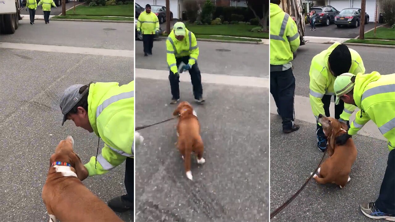 Excited dog greets sanitation workers