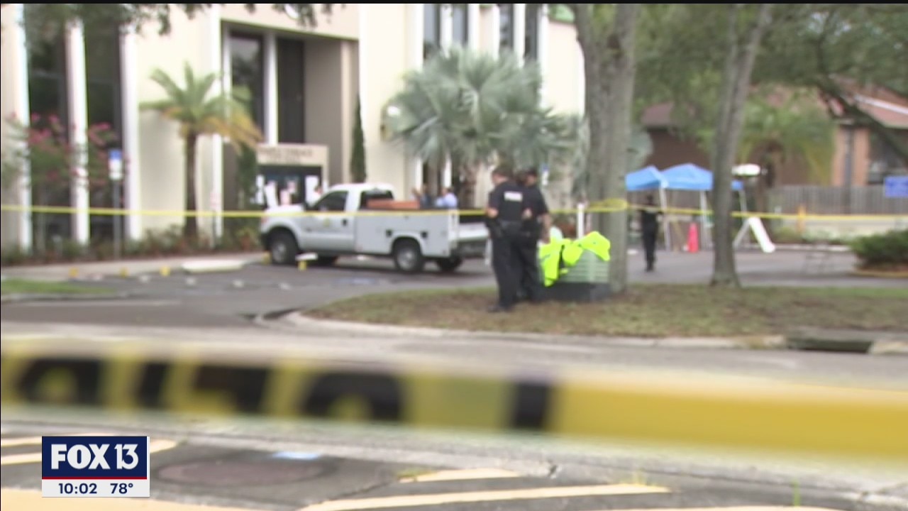 Police in Temple Terrace say an officer was forced to open fire on a woman who began swinging a “large knife” toward the officer at city hall Friday afternoon.