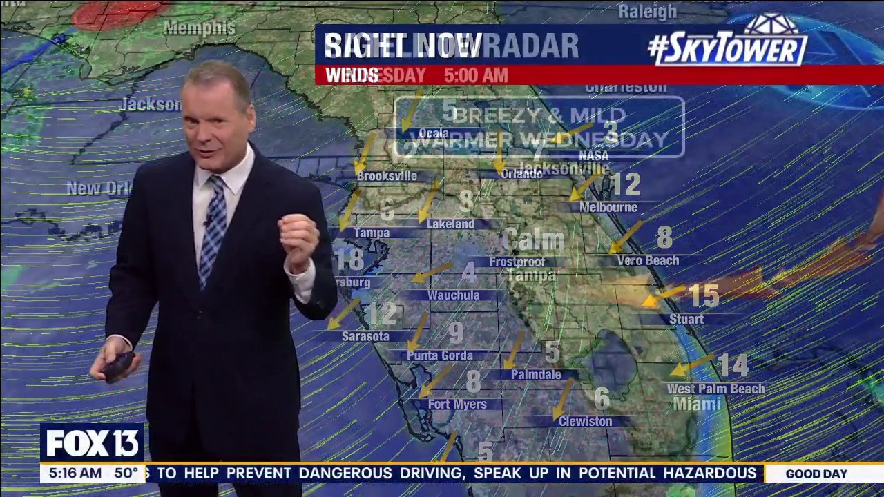 FOX 13 Meteorologist Dave Osterberg says Wednesday morning will be partly cloudy, breezy and mild with a high of 75 degrees.