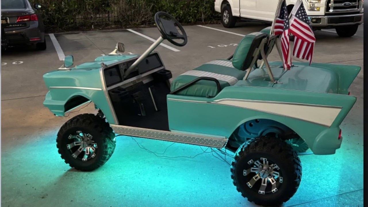 Good Day Viewer, John, wanted to show off his custom golf cart, themed after a 1957 Chevy. It was custom built using a golf cart frame, and even has lights underneath.